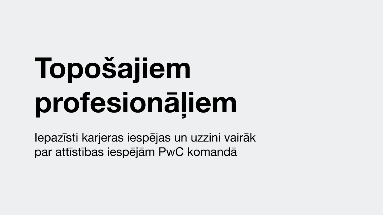 PwC mēs atklājam slēptos talantus, veidojam ilgtermiņa attiecības un pārvēršam izaicinājumus iespējās. Mēs paplašinām iespēju robežas saviem klientiem un kopienām, vienlaikus sniedzot tev atbalstu, lai radītu patiesi nozīmīgu ietekmi — tādu, kas sniedzas tālāk par PwC.